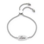 Shapely – that is this stainless steel bracelet for women. Between the Venetian chain links there is an organically shaped ornamental element, which is matt on the front side and decorated with zirconia. The back (inside) of the element can be engraved individually. The bracelet can be adjusted continuously to the respective wrist by means of the practical pull fastener.